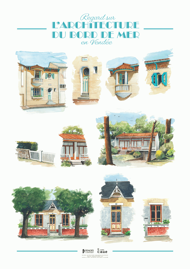 L’affiche Regard sur l’architecture du bord de mer en Vendée présente un panel de maisons du bord de mer vendéen illustré par Jean-Pierre ARCILE.